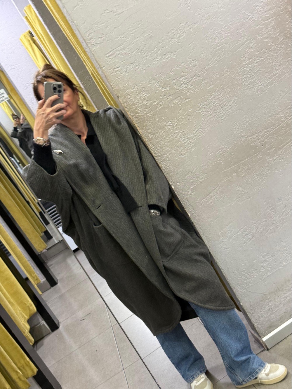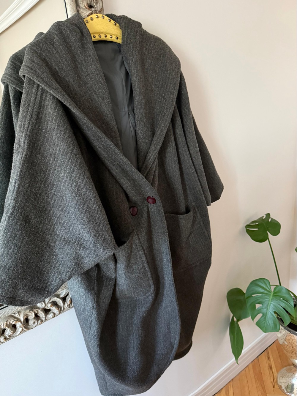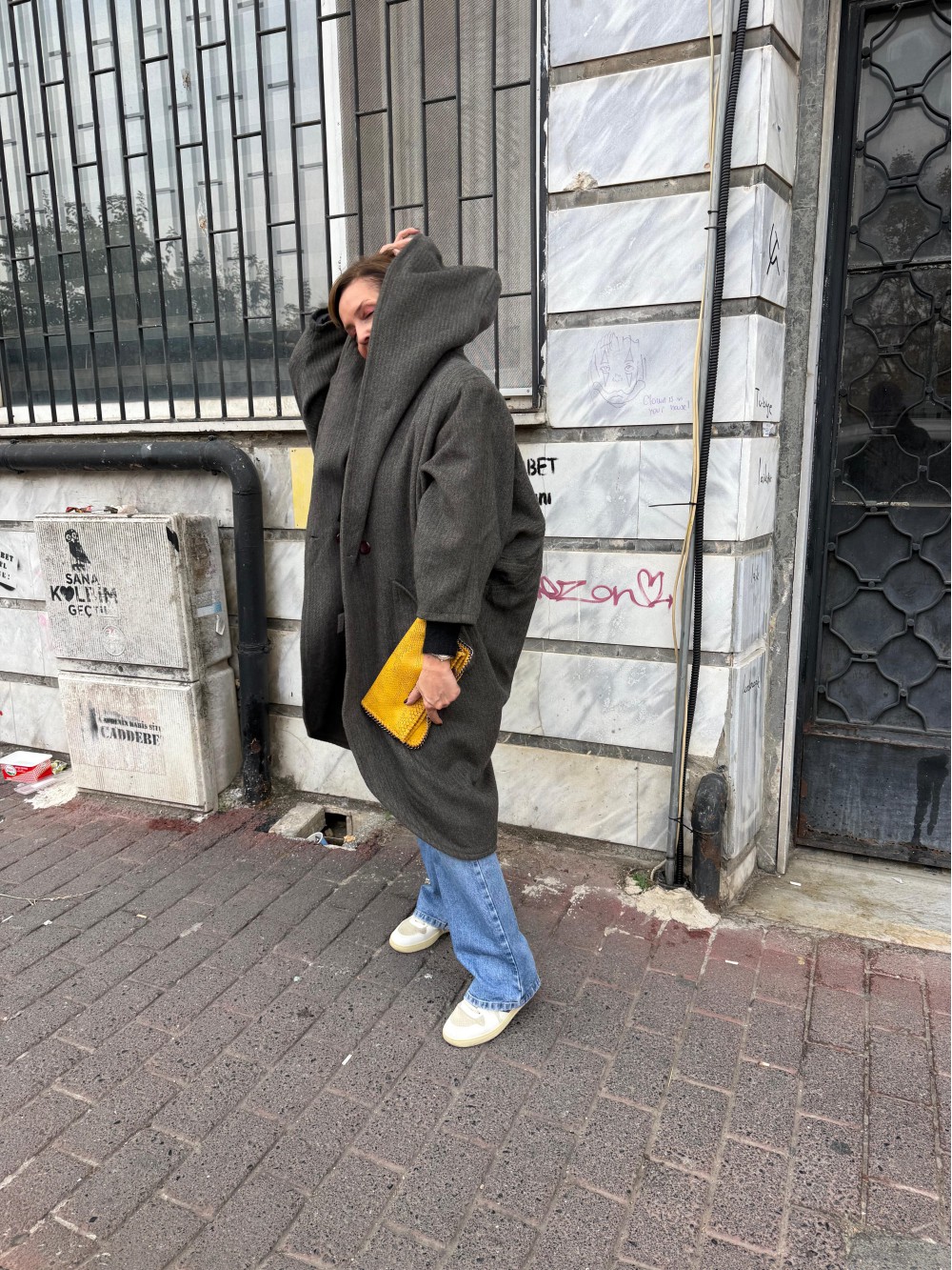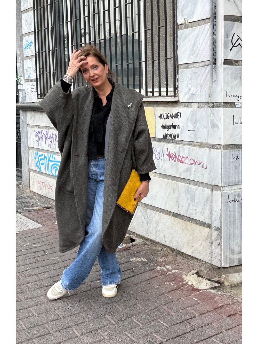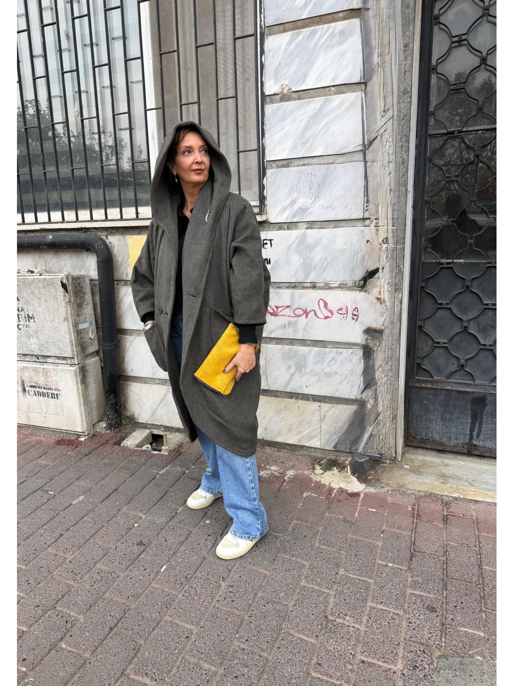 Vintage Haki Çizgili Yün Kapüşonlu Kaban