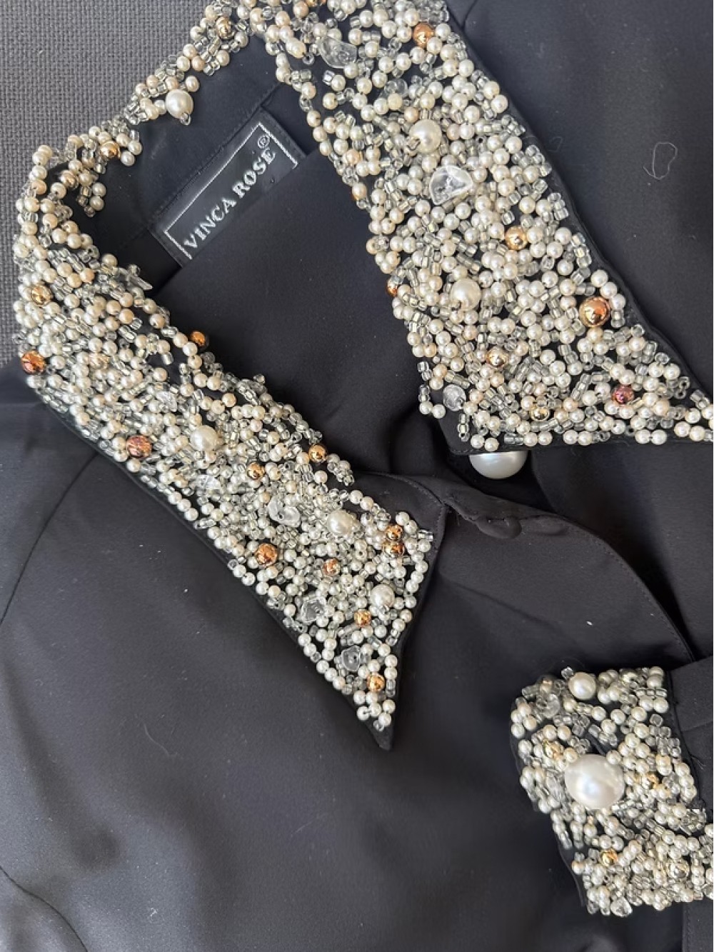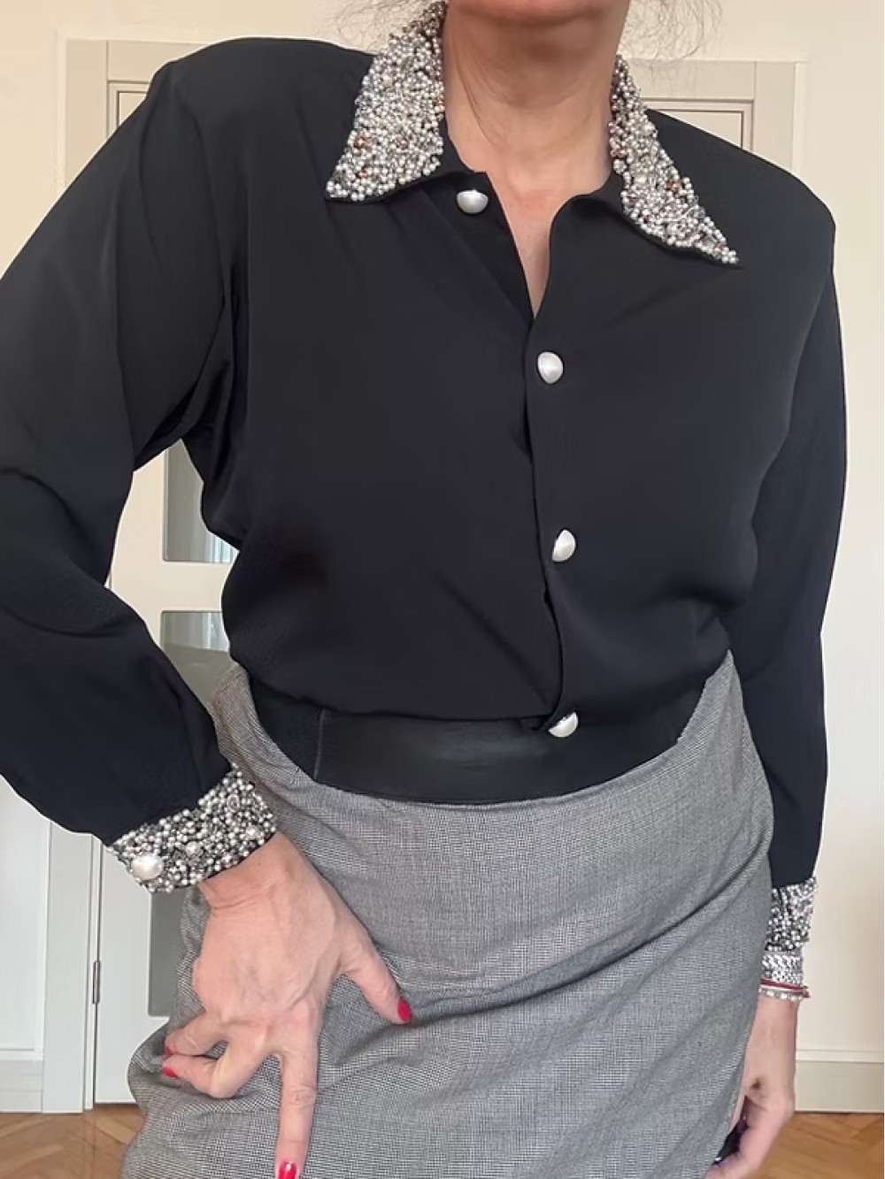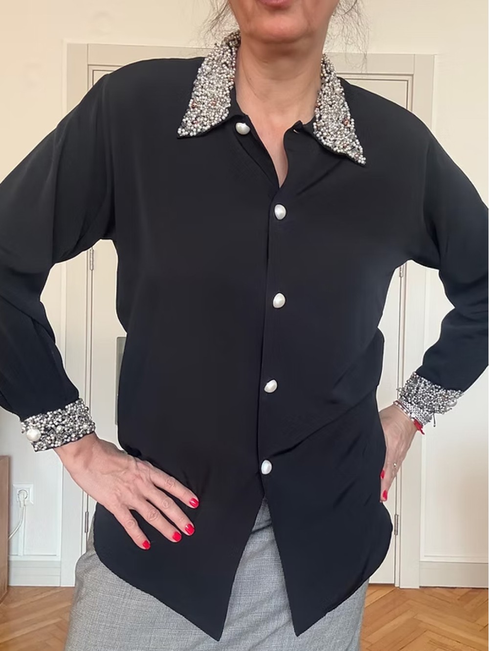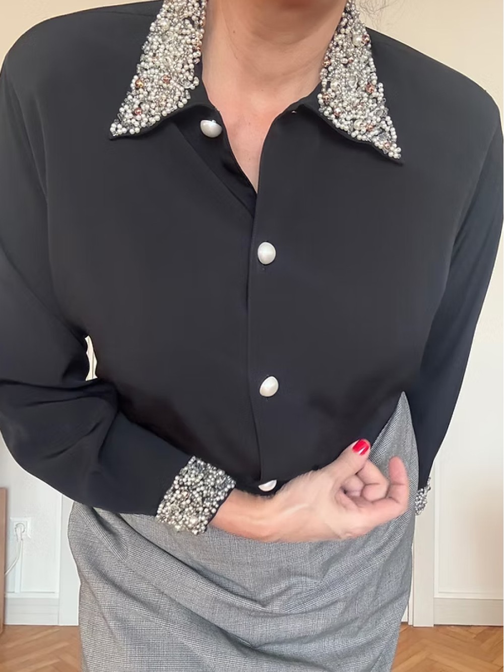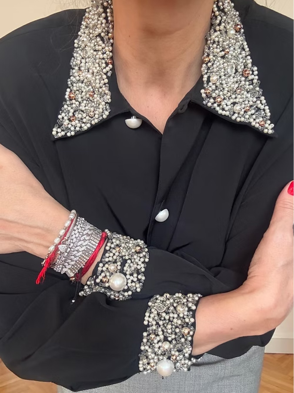 Vintage Yaka ve Kolları İnci İşlemeli Gömlek