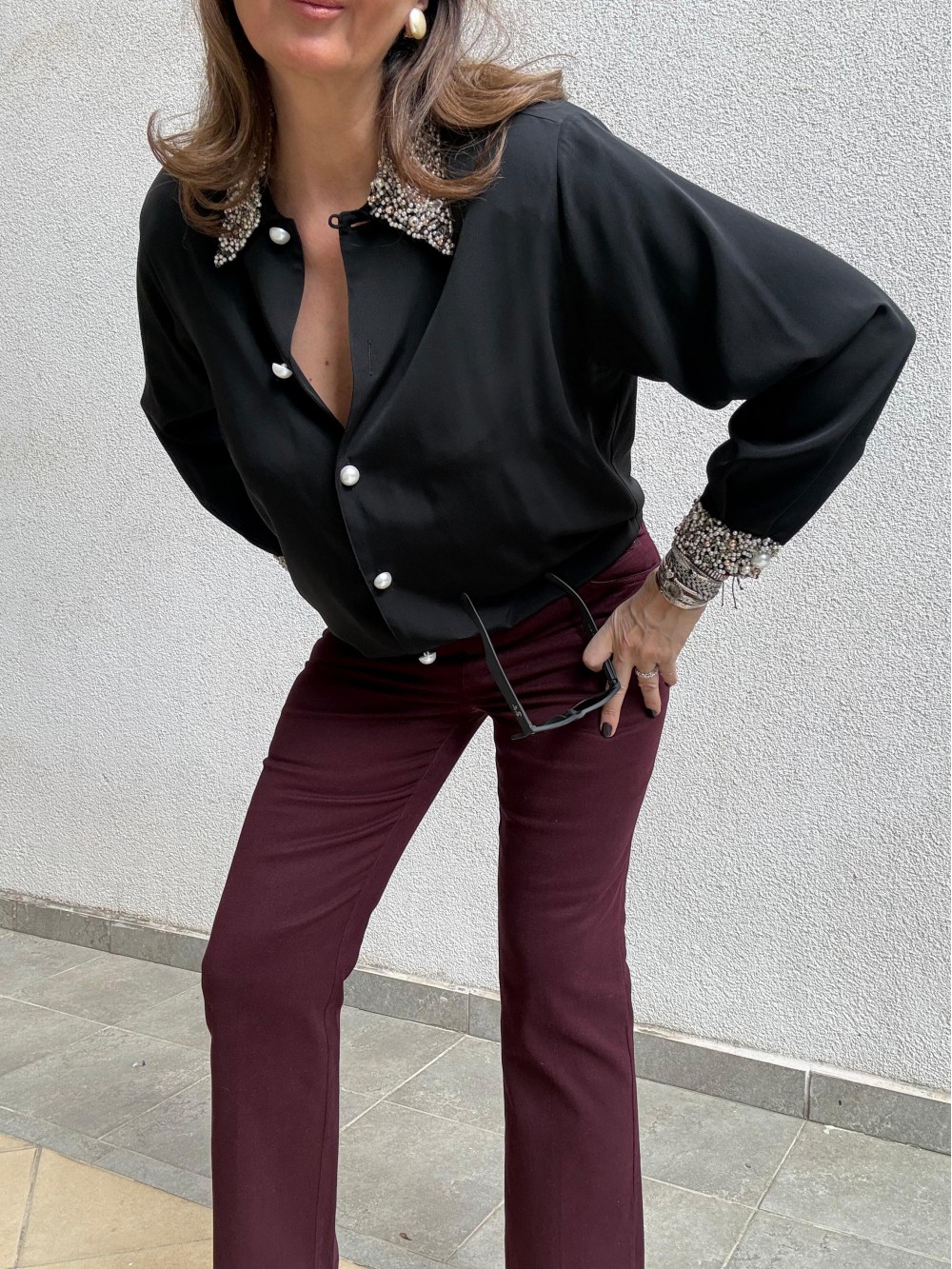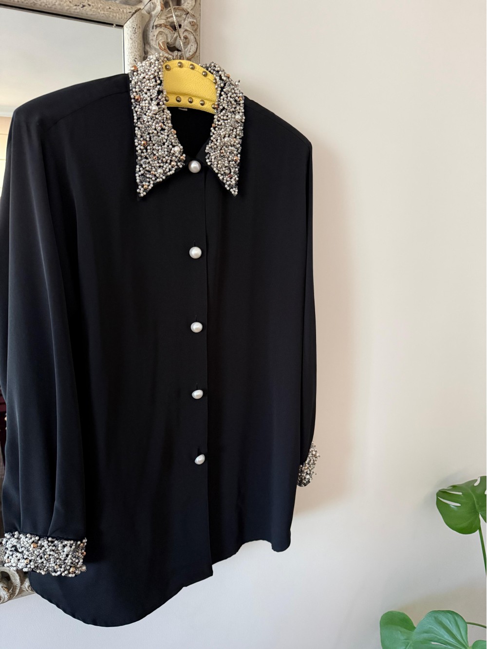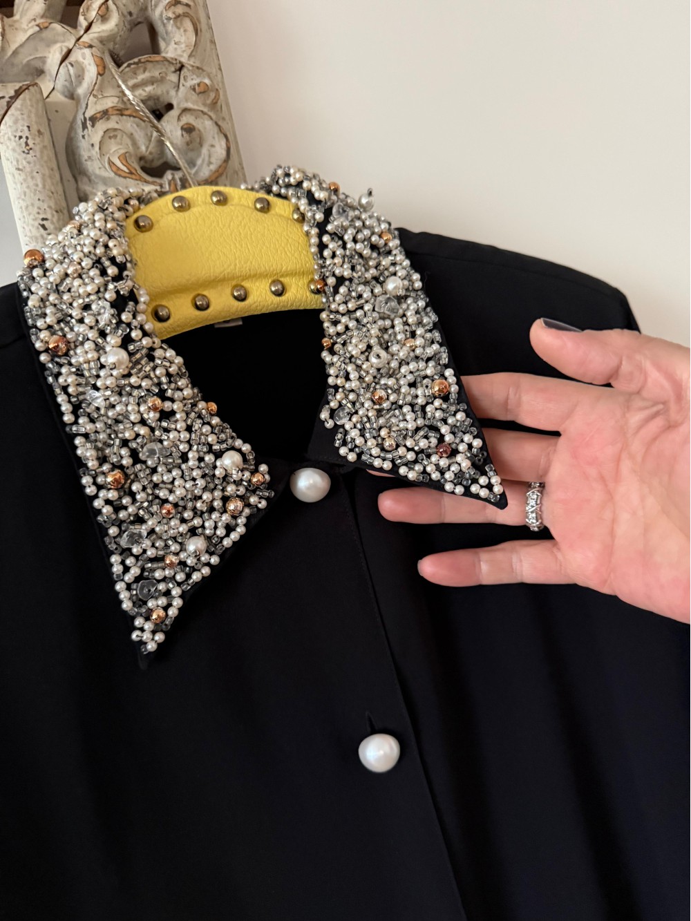 Vintage Siyah Yaka ve Kolları İnci İşlemeli Gömlek