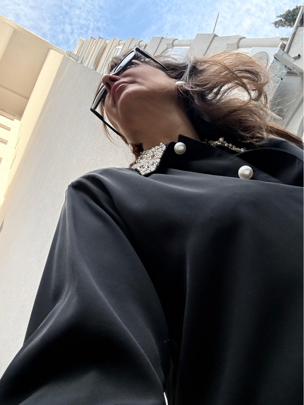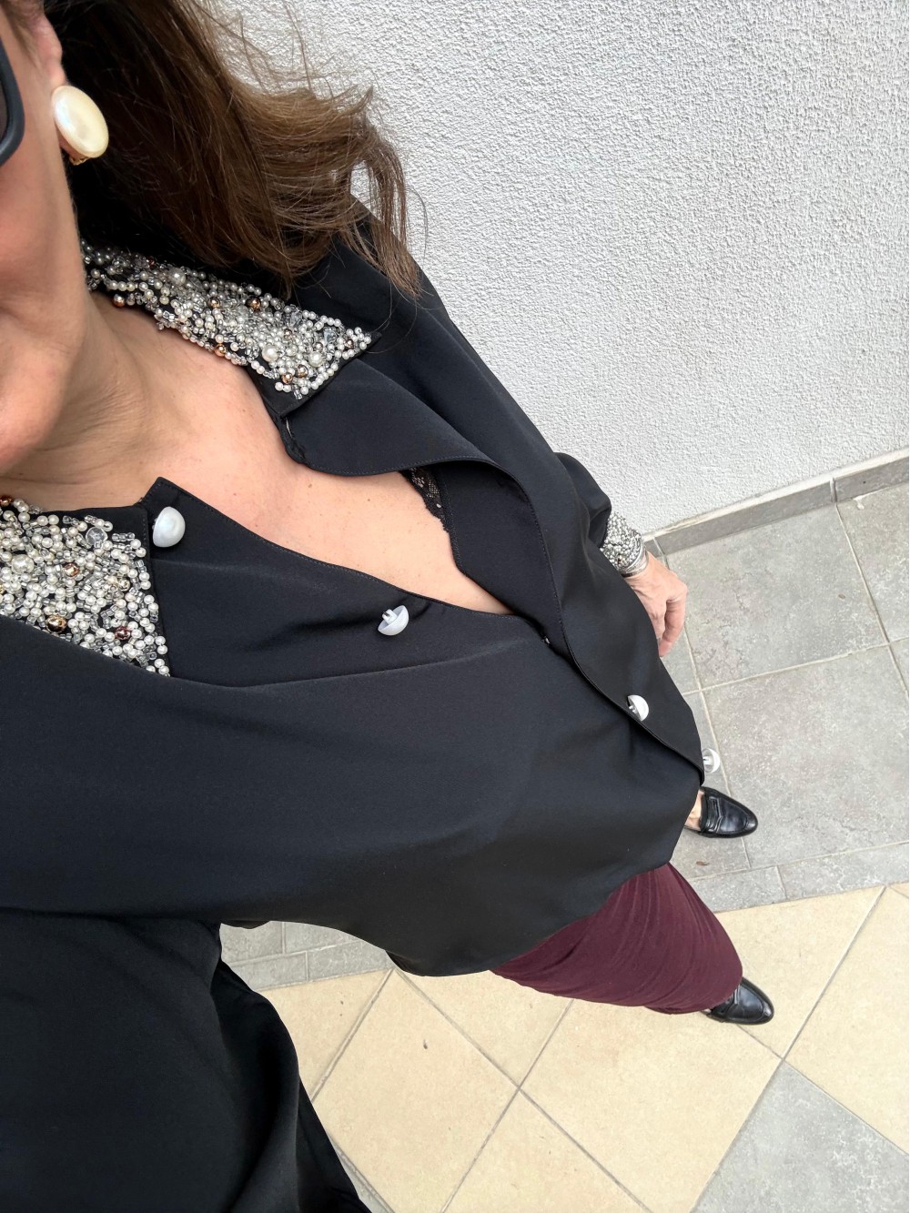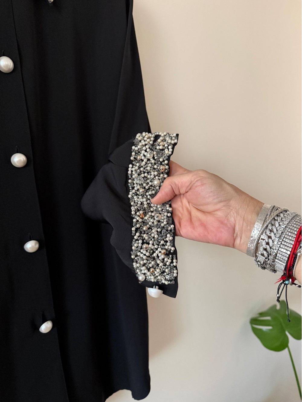 Vintage Siyah Yaka ve Kolları İnci İşlemeli Gömlek